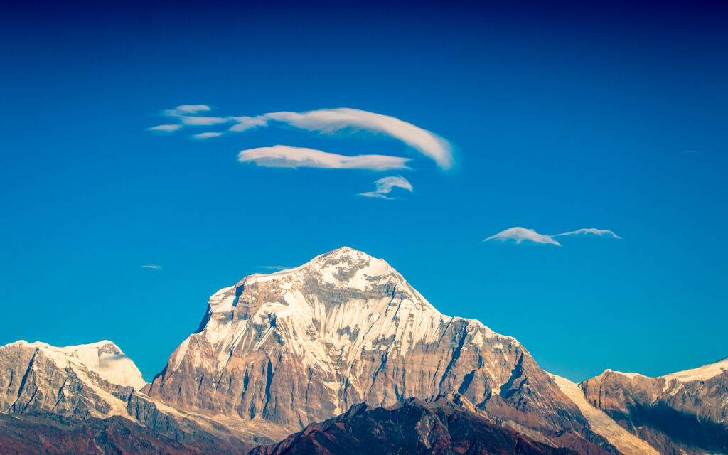 Mount Dhaulagiri, the 7th highest mountain in the world, stands at the forefront throughout the trek, with its towering presence casting an imposing shadow over the surrounding landscapes. The trek circumnavigates this mighty peak, offering spectacular views of the entire Dhaulagiri massif, the Kali Gandaki Gorge, and the deep valleys surrounding the mountain.